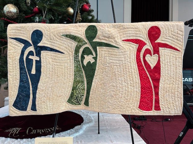 The wall hanging is called Faith, Hope and Love which are depicted by amorphous angels that each contain a shape. Faith is represented by a cross, Hope by a dove and Love with a heart. -- Janie Patterson
